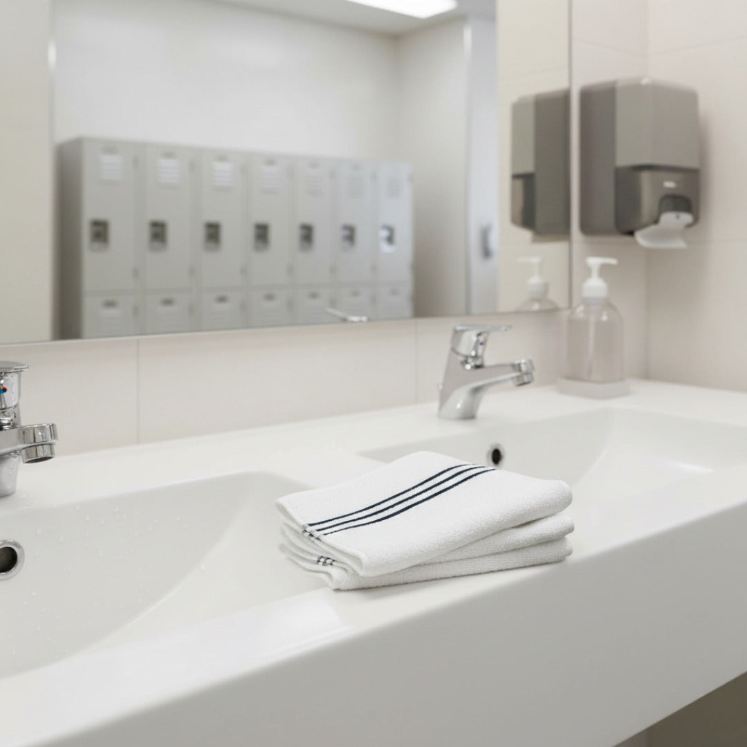 With their navy three stripe pattern, these towels are easy to identify and separate during laundry, making them perfect for gyms, fitness centers, and wellness facilities. They offer reliable performance, wash after wash, while adding a clean and professional touch to any space.