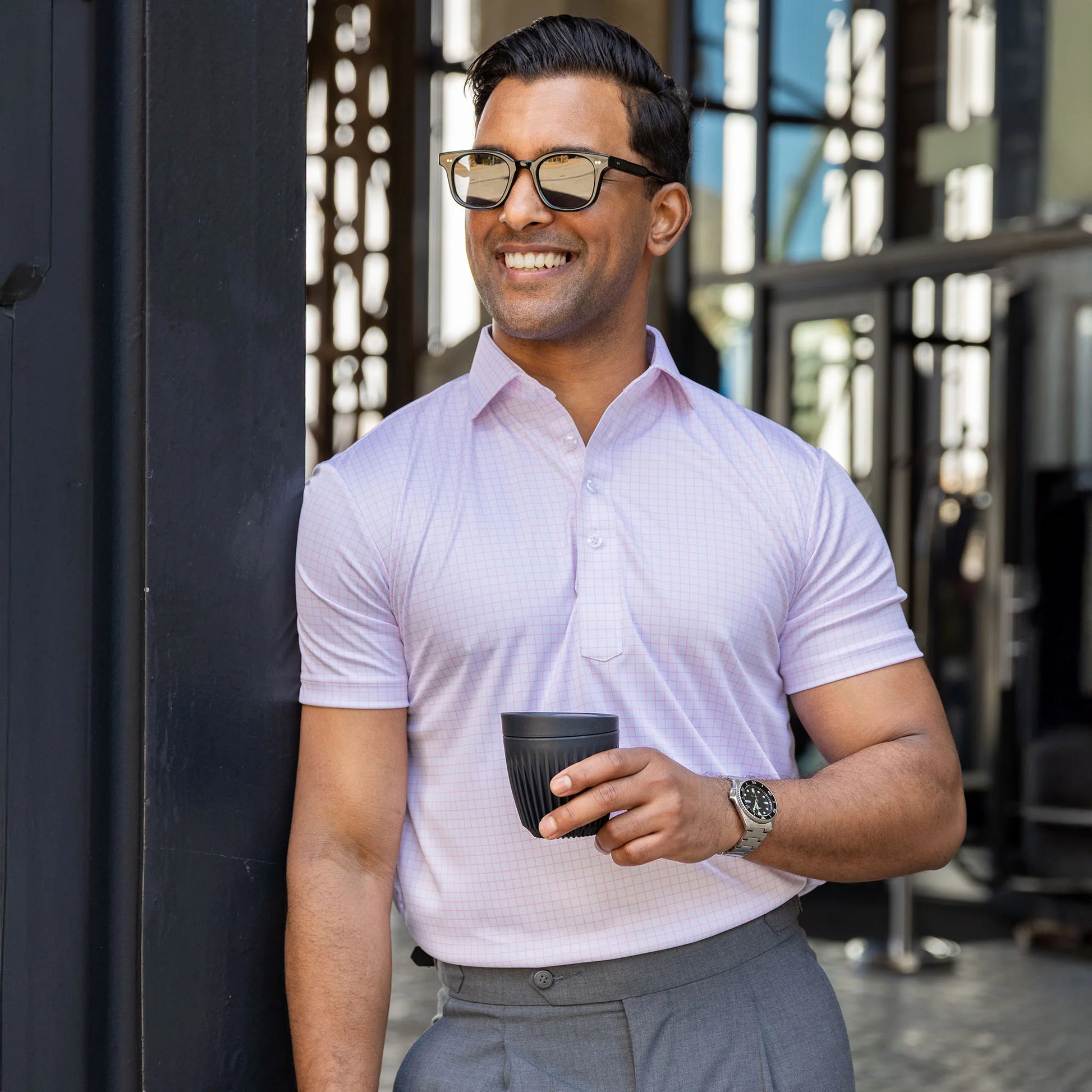 The versatile Semi-Spread Collar Polo. Woven for comfort and designed for style. This shirt pairs a formal semi spread dress collar with an extra comfortable, 4-way stretch, short-sleeved polo. The semi-spread collar has all the benefits of our ever popular English spread collar with a streamlined size and built to accommodate a larger tie knot