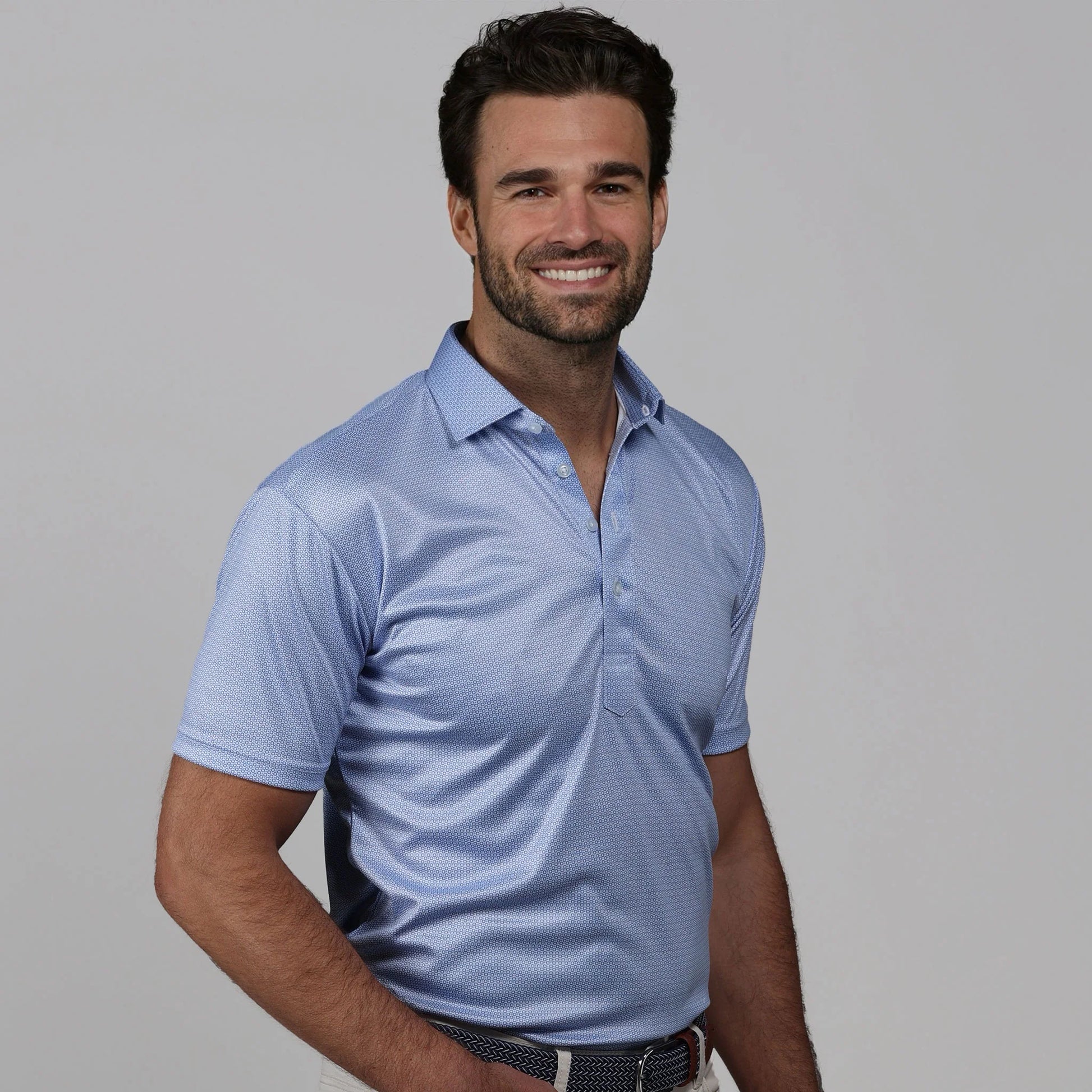 The versatile Semi-Spread Collar Polo. Woven for comfort and designed for style. This shirt pairs a formal semi spread dress collar with an extra comfortable, 4-way stretch, short-sleeved polo. The semi-spread collar has all the benefits of our ever popular English spread collar with a streamlined size and built to accommodate a larger tie knot